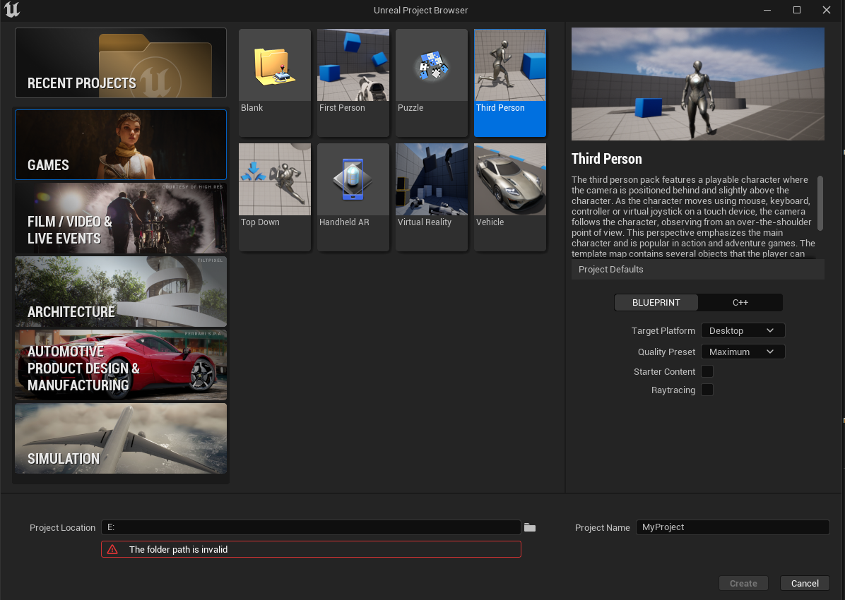 Create that project by launching the Unreal Engine instance and choose Third Person Project with Blueprint as the project default.
