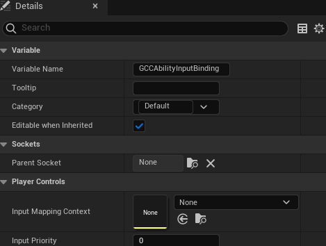 We can just use the preconfigured Binding system on `BeginPlay` or using `GCCAbilityInputBinding` component.In this setup, we want to use the component as it comes with some convenience functions for input binding.
