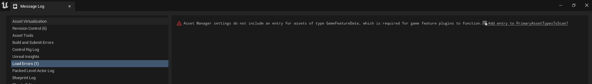 Dont panic! This is not an error, this is a validation check from the `Game Features plugin` comes by default when you enabled the plugin and since GCC use this plugin for our `GameFeatureAction`.