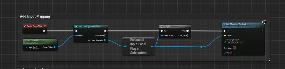 We can delete the `BeginPlay` setup and use the component to bind our input mapping context. The `Third Person template` also comes with preconfigured `InputActions` and `InputMappingContext` in `ThirdPerson/Input` folder.