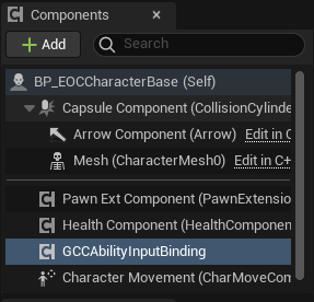 Click the `Add` button in the components panel, and add `GCCAbilityInputBinding` to your Character<br>