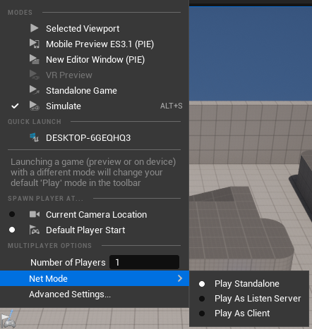 Once you finish, find the three dot near `Play` button, find `NetMode` and choose `Play As Client`.